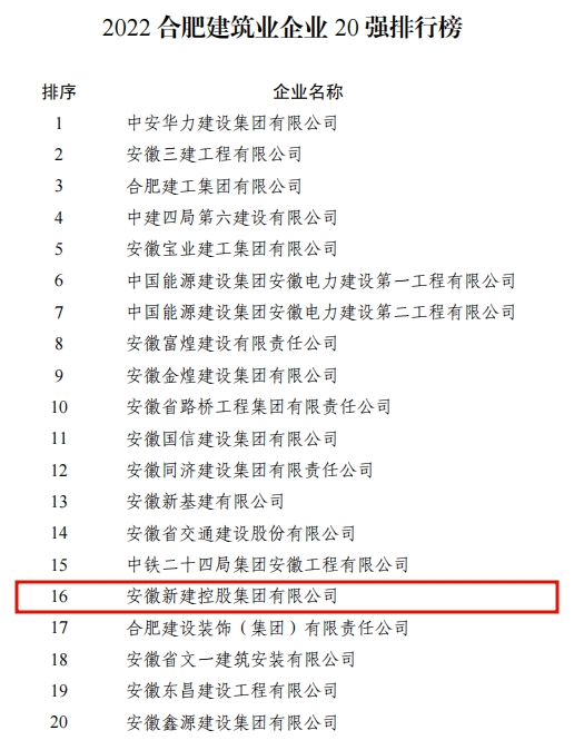 2022年12月8日,合肥市企業(企業家)聯合會頒布合肥建筑業企業20強榜單(排序以2021年度營業收入為準),安徽新建控股集團再次榜上有名,榮登2022合肥建筑業企業20強排行榜第16位。