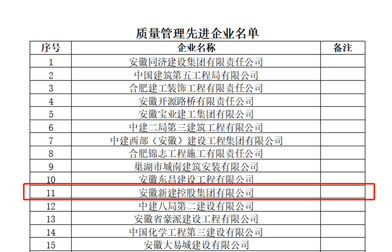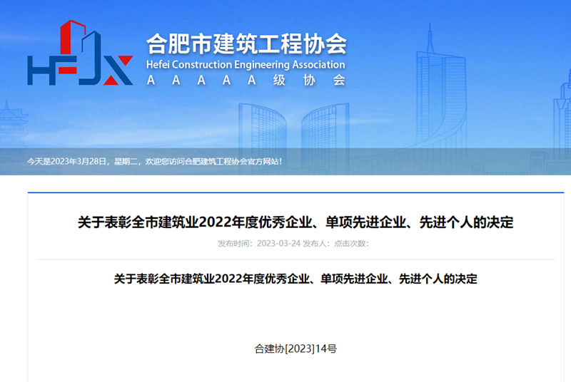 近日,合肥市建筑工程協會發布《關于表彰全市建筑業2022年度優秀企業、單項先進企業、先進個人的決定》,安徽新建斬獲多項榮譽——“合肥建筑業2022年度優秀施工企業”、“合肥建筑業2022年度質量管理先進企業”稱號;集團公司工程管理中心陶春華、高峰被授予“合肥建筑業2022年度優秀項目經理”稱號,蔡偉、陳玉懷、姚琪被授予“合肥建筑業2022年度優秀勞資專管員、質量管理先進個人、安全管理先進個人”稱號。