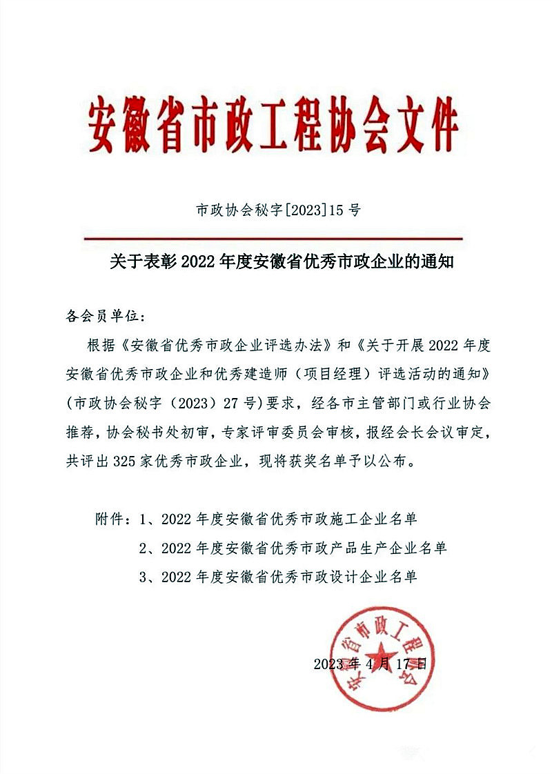 近日,根據(jù)安徽省市政工程協(xié)會《關(guān)于開展2022年度安徽省優(yōu)秀市政施工企業(yè)和優(yōu)秀建造師(項(xiàng)目經(jīng)理》評選活動的通知》和《安徽省優(yōu)秀市政施工企業(yè)評選辦法》、《安徽省市政施工企業(yè)優(yōu)秀項(xiàng)目經(jīng)理評選辦法》要求,經(jīng)專家評審委員會審核通過。