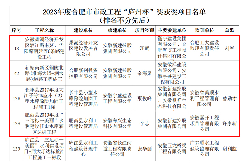 2023年9月6日,合肥市市政工程協會發布了《關于2023年度合肥市市政工程“廬州杯”獎獲獎項目名單的公示》,公司承建的安徽巢湖經濟開發區渡江路南延、華陽路南延等6條路建設工程,長豐縣2017年度大江子等25座小(2)型水庫除險加固施工1標工程,新站高新區銅陵北路(淮海大道-泗水路)道路施工工程,肥西縣2019年度“三達標一美麗”水利建設托山水庫灌區達標工程等項目榮獲2023年度合肥市市政工程“廬州杯”獎。