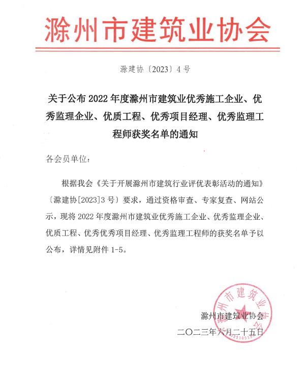 2023年6月25日,滁州市建筑業協會發布《關于公布2022年度滁州市建筑業優秀施工企業、優秀監理企業、優秀工程、優秀項目經理、優秀監理工程師獲獎名單的通知》,集團公司被評為2022年度滁州市建筑業優秀施工企業,公司承建的濠州路、淮河大道和郭圩路三條道路延伸段工程被評為2022年度滁州市建筑業優質工程。