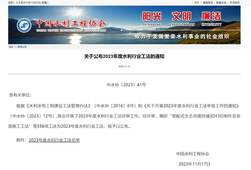11月17日,中國水利工程協會發布了2023年度水利行業工法評審結果。經評審,集團公司申報的《大直徑壓力鋼管智能機械制作及安裝施工工法》,被評為2023年度水利行業工法。