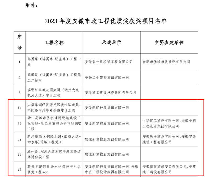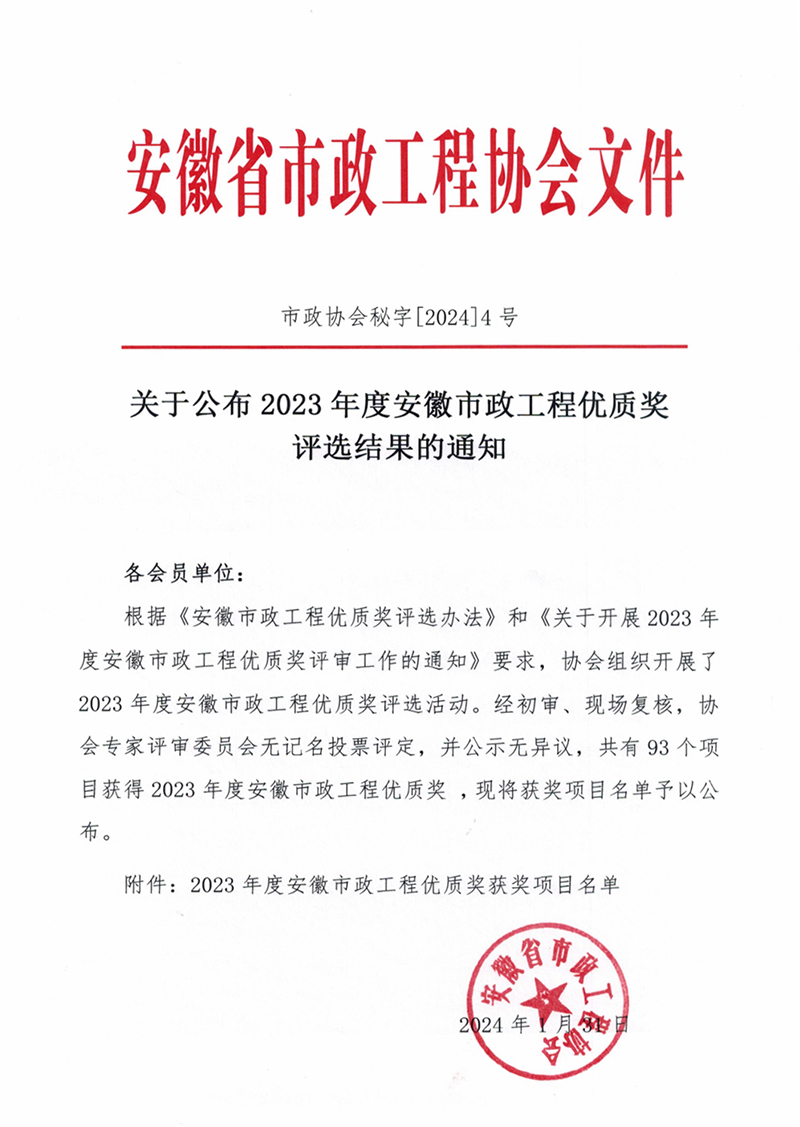 1月31日,安徽省市政工程協會公布關于“2023年度安徽省市政工程優質獎”評選結果的通知,集團公司承建的安徽巢湖經濟開發區渡江路南延、華陽路南延等6條路建設工程、碭山縣城市防洪排澇設施建設工程項目-生態調蓄綜合子項目EPC工程、新站高新區銅陵北路(淮海大道泗水路)道路工程施工、濠州路、淮河大道和郭圩路三條道路延伸段工程、黟縣豐溪河良好水體保護與生態修復工程epc等5項工程榮獲2023年度安徽省市政工程優質獎獎項。
