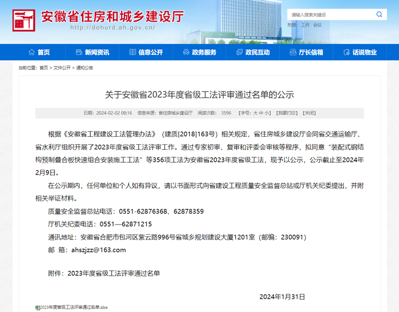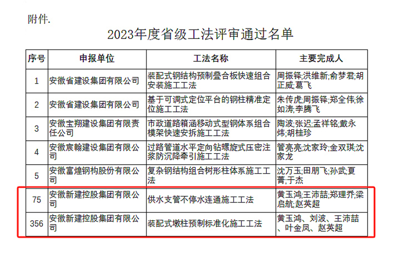 近日,安徽省住房和城鄉建設廳公布了2023年度省級工法名單,集團公司申報的《裝配式梁組合封閉箍筋施工工法》、《供水支管不停水連通施工工法》等2項工法獲評安徽省省級工法。