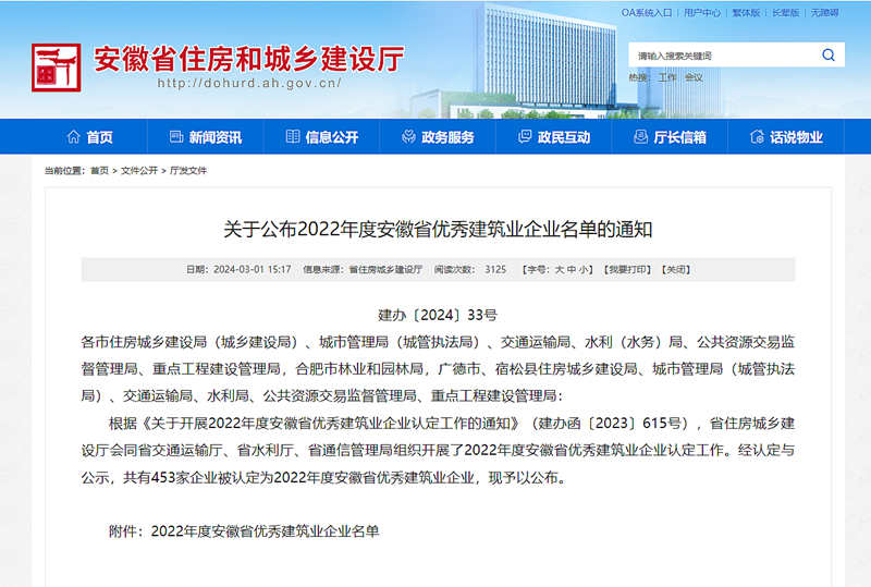 3月1日,安徽省住房和城鄉(xiāng)建設(shè)廳公布了“2022年度安徽省優(yōu)秀建筑業(yè)企業(yè)”名單,安徽新建控股集團(tuán)再次榮登榜單,榮獲“2022年度安徽省優(yōu)秀建筑業(yè)企業(yè)”稱號。