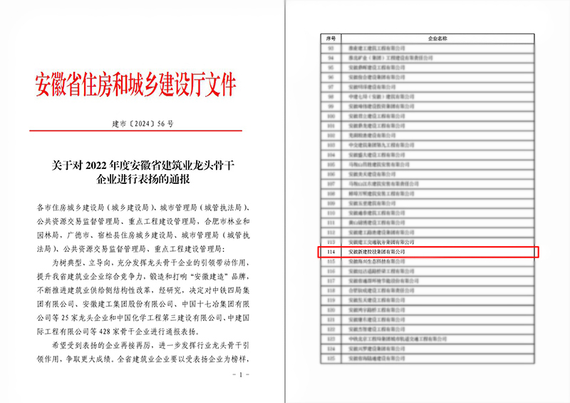 近日,在安徽省住房城鄉建設廳召開的全省建筑業發展工作推進會上,安徽新建控股集團有限公司被安徽省住房和城鄉建設廳、安徽省交通運輸廳、安徽省水利廳、安徽省通信管理局聯合表彰為“2022年度安徽省建筑業骨干企業”,并再次榮獲“安徽省優秀建筑業企業”稱號!
