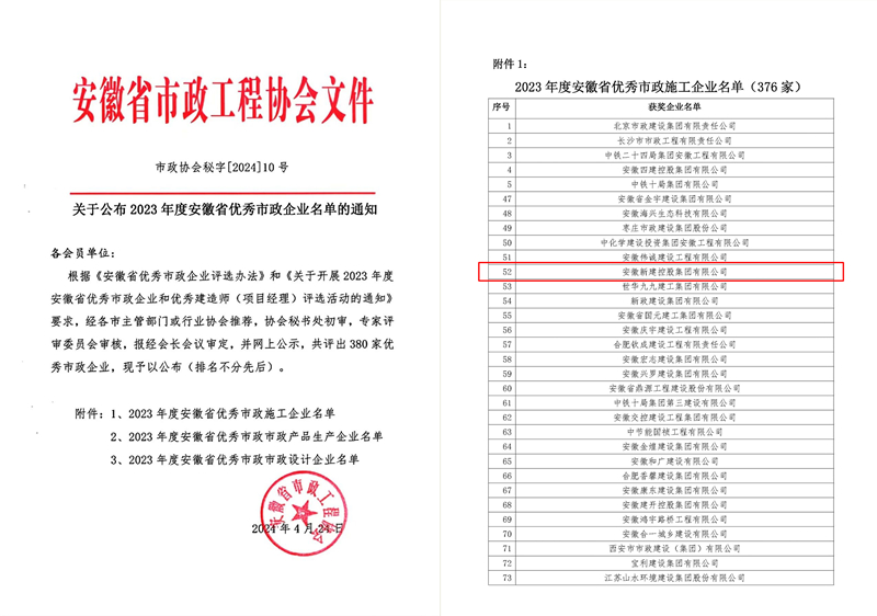 4月24日,安徽省市政工程協會發布通知,根據《安徽省優秀市政施工企業評選辦法》和《關于開展2023年度安徽省優秀市政施工企業和優秀建造師(項目經理)評選活動的通知》要求,經專家評審委員會審核通過,安徽新建控股集團有限公司榮獲2023年度“安徽省優秀市政施工企業”榮譽稱號。
