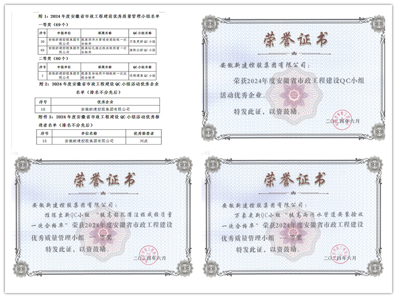 交流會上,經過激烈角逐,申報QC課題最終榮獲一等成果2項、二等成果1項的優異成績。其中公司萬象更新QC小組《提高雨污水管道安裝驗收一次合格率》和推陳出新QC小組《提高鉆孔灌注樁成樁質量一次合格率》獲得2024年度安徽省市政工程建設優秀質量管理小組一等獎,運籌建策QC小組《提高復雜地質中鋼板樁一次沉樁合格率》獲得優秀質量管理小組二等獎。