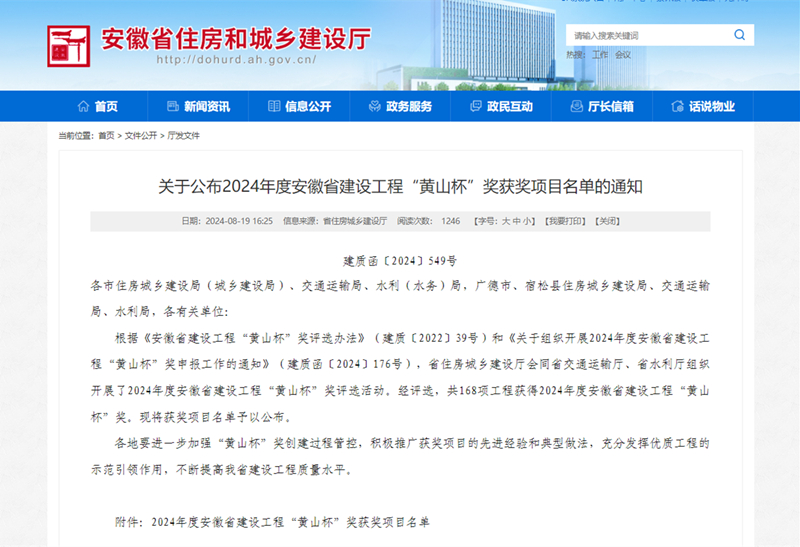 8日19日,安徽省住房和城鄉(xiāng)建設(shè)廳發(fā)布《關(guān)于公布2024年度安徽省建設(shè)工程“黃山杯”獎獲獎項目名單的通知》,安徽新建控股集團承建的新站高新區(qū)銅陵北路(淮海大道-泗水路)道路工程喜獲2024年度安徽省建設(shè)工程“黃山杯”獎。