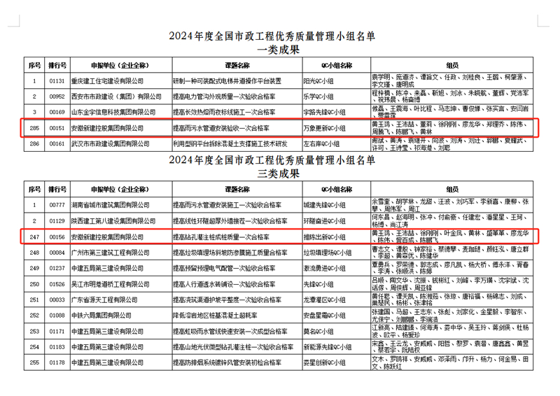 近日,中國市政工程協會公布了2024年度全國市政工程優秀質量管理小組名單,集團公司萬象更新QC小組申報的《提高雨污水管道安裝驗收一次合格率》榮獲一類成果;推陳出新QC小組申報的《提高鉆孔灌注樁成樁質量一次合格率》榮獲三類成果。