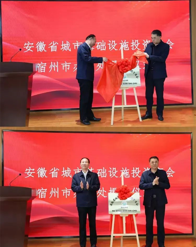 安徽省工商聯宣教處副處長(主持工作)張鳳翔與安徽省城市基礎設施投資商會會長、安徽新建控股集團有限公司董事長王杰英共同為宿州市辦事處揭牌,現場掌聲雷動,這一時刻宣告辦事處全面投入運營。
