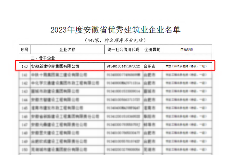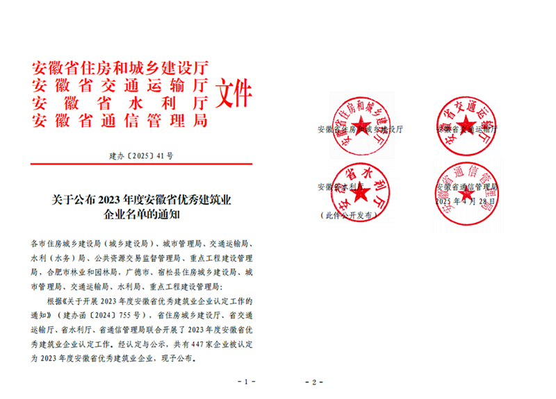 近日,安徽省住房和城鄉(xiāng)建設(shè)廳、省交通運(yùn)輸廳、省水利廳、省通信管理局聯(lián)合公布"2023年度安徽省優(yōu)秀建筑業(yè)企業(yè)"名單。集團(tuán)公司憑借非凡實(shí)力,被認(rèn)定為“安徽省建筑業(yè)骨干企業(yè)”,并連續(xù)四年榮獲“安徽省優(yōu)秀建筑業(yè)企業(yè)”稱號(hào)!