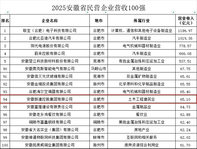 10月16日上午,2025年安徽省民營企業百強發布會在合肥隆重舉行。安徽省工商聯、省發改委、省工信廳、省市場監管局及省人力資源和社會保障廳聯合發布了2025年安徽省民營企業營收百強、制造業百強和服務業百強榜單。安徽新建控股集團在2025年安徽省民營企業營收百強榜單中位列第94位,這一成績取得充分展現了集團公司不斷增強的綜合實力。